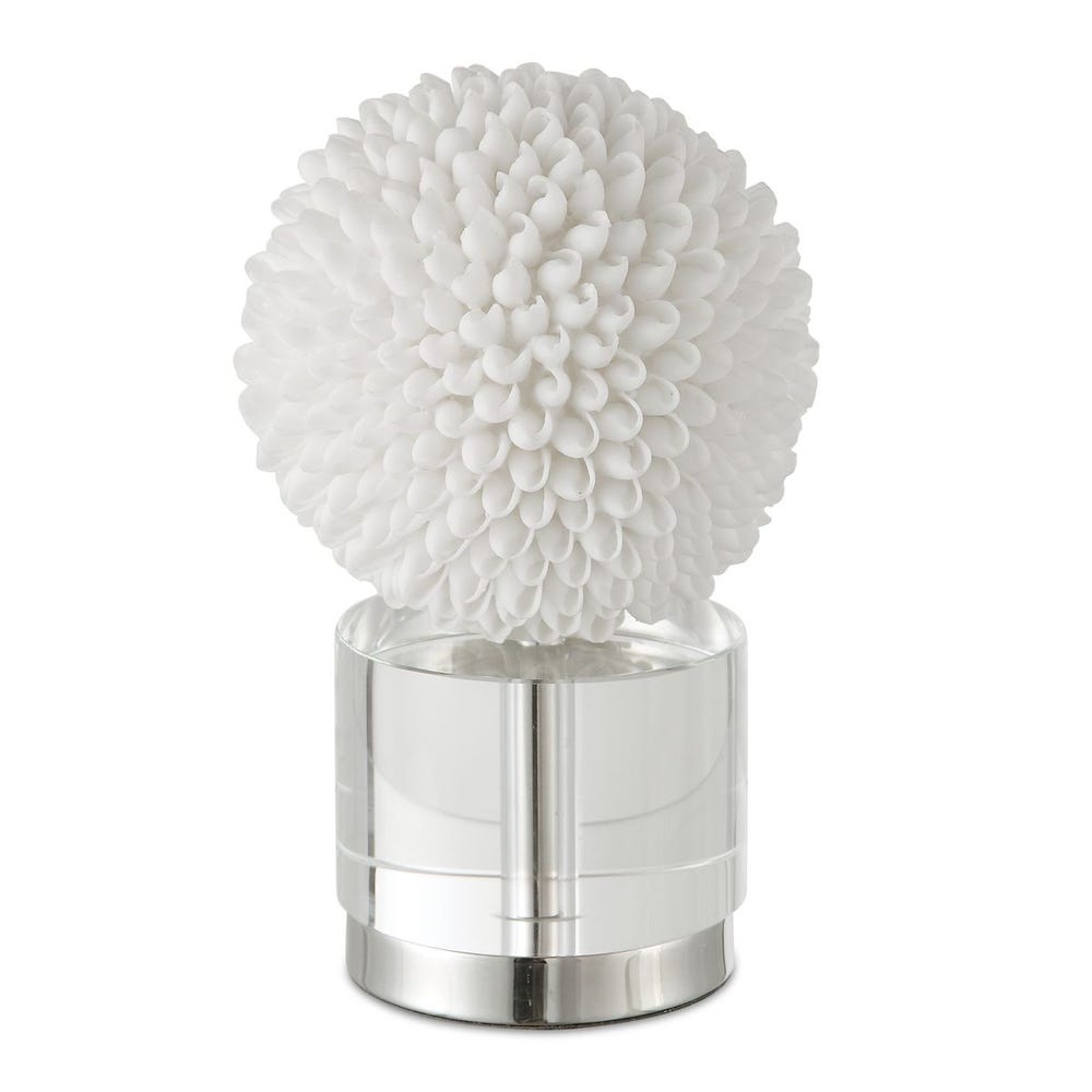 This decorative sphere is handcrafted with faux sea shells, featured with polished nickel plated accents and cylinder shaped crystal base.