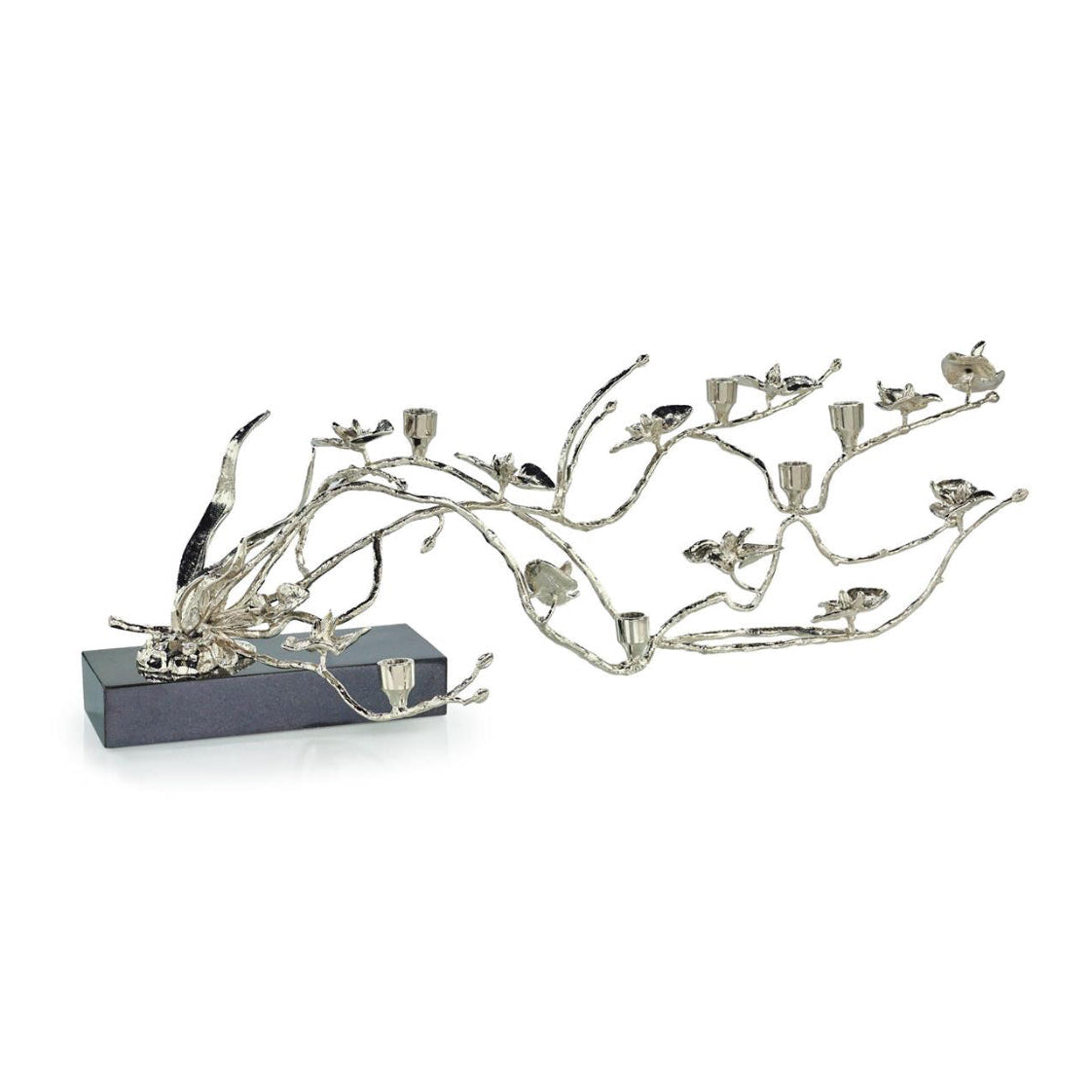 The Orchids in Bloom Candleholder is a gorgeous, naturally inspired statement piece crafted from brass in a Nickel finish. The design showcases a flowing orchid with detailed flora upon long serpentine stems that feature six candle sockets. The piece is mounted on a square base of natural black marble, completing the look.