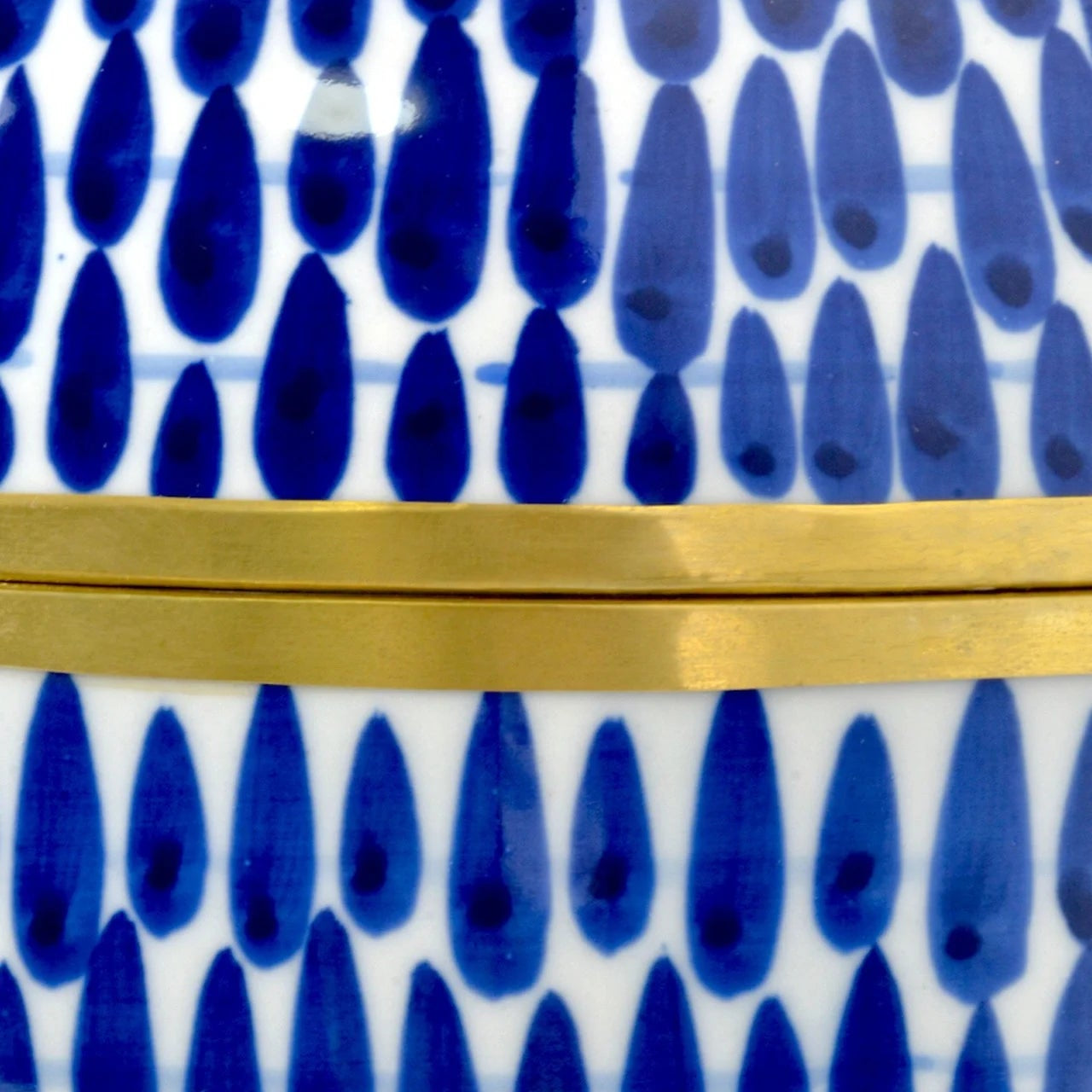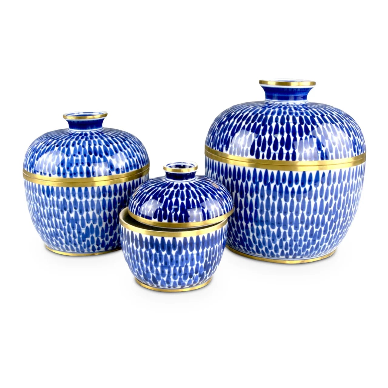 The Plavan Jar Set includes three lidded offering boxes with luminous brass rings running the circumference of the bottom, the top, and along each edge where the lid meets the jar. The electric blue pattern that seems to drip along the surface of each jar is actually painted by hand. Proving that these pieces are artisanal in their creation, some brushstrokes show the culmination point where the artist lifted the brush on the lighter oblong shapes, the action leaving a darker spot at that point. Though these blue decorative jars were inspired by centuries-old designs, they have a surprisingly contemporary feel.