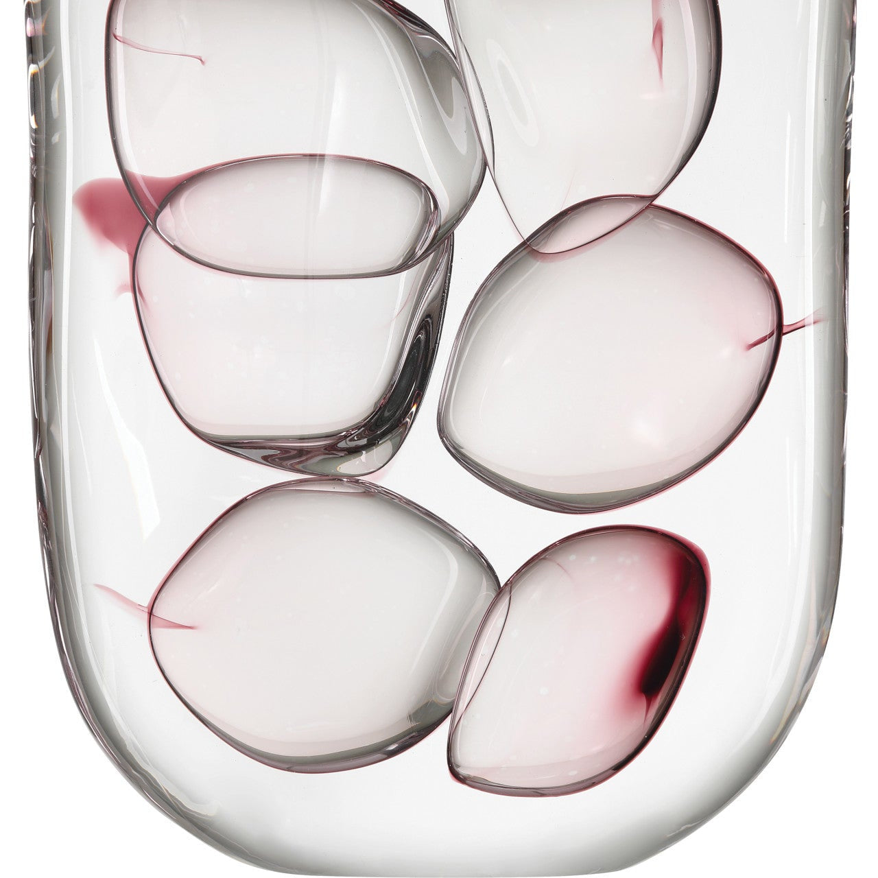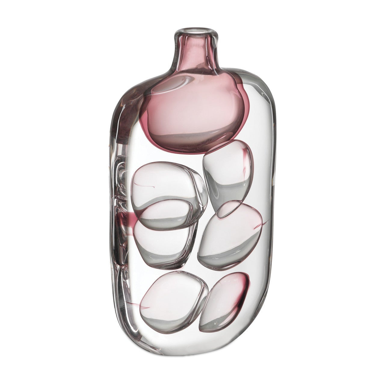 The Vicolino Large Vase is made of clear and purple hand-made glass with organically placed bubbles floating within its overall form. The vase was created using a Venetian glass technique that is very rarely practiced in modern times. The slim silhouette has a shape that is reminiscent of a perfume bottle, the narrowness making the vase ideal for nightstands, smaller consoles, or shelves that are not very deep. Both sculptural and functional, this vase will be a glamorous accent piece in the most sophisticated setting.