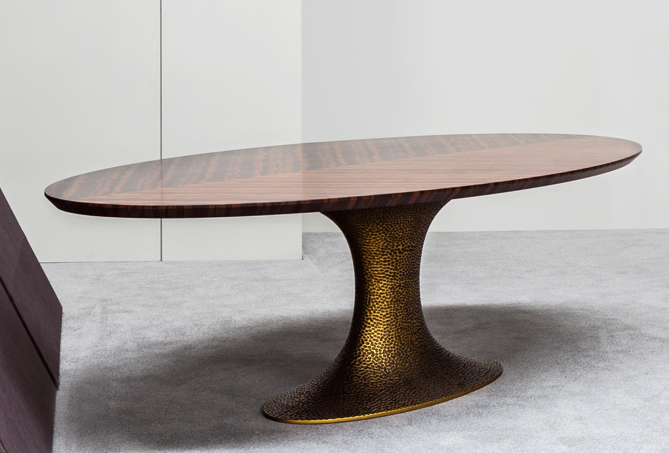 Distinguished with its stunning hammered or smooth resin base, Ines sets any space apart. It has a variety of forms like oval and tonneau as well as many surface options including Oak, Walnut, Imbuia, Radica, Eucalyptus or Olive veneers.