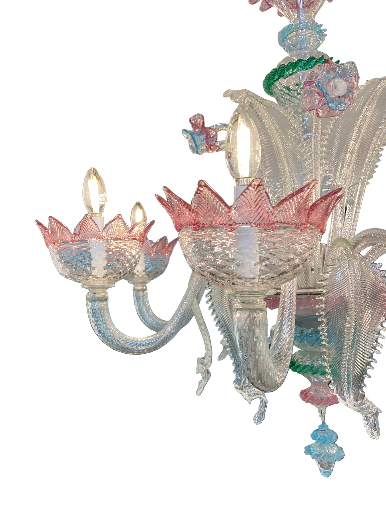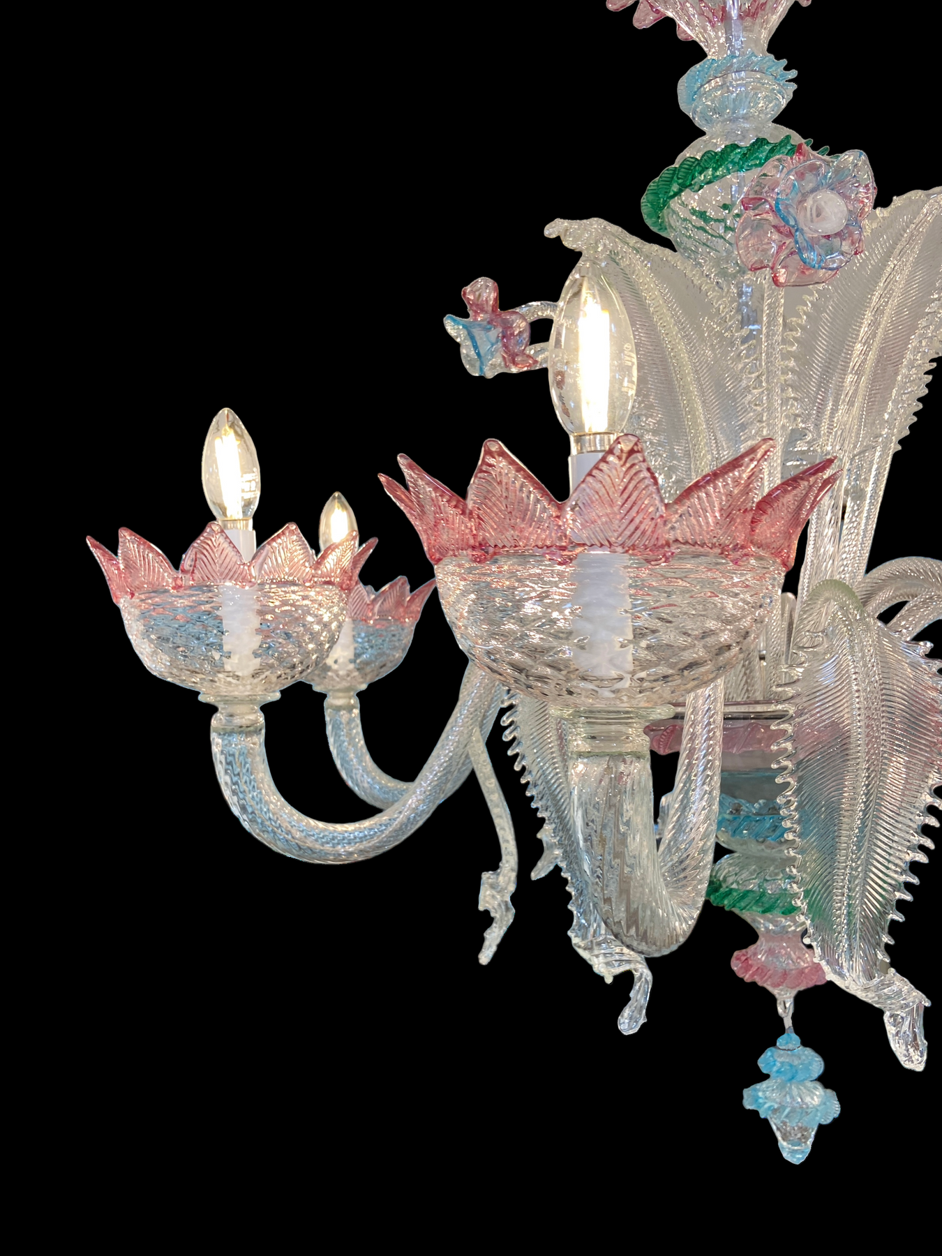 This exquisite Murano glass chandelier is a masterpiece consisted of delicate pink and green floral motifs blossom gracefully around crystal-clear arms that shimmer with opulence. Each petal and leaf are meticulously crafted, transforming light into a romantic, ethereal glow. Perfect for an elegant dining room or grand foyer, this luxurious chandelier is more than illumination, it is a statement of refined taste and timeless beauty.