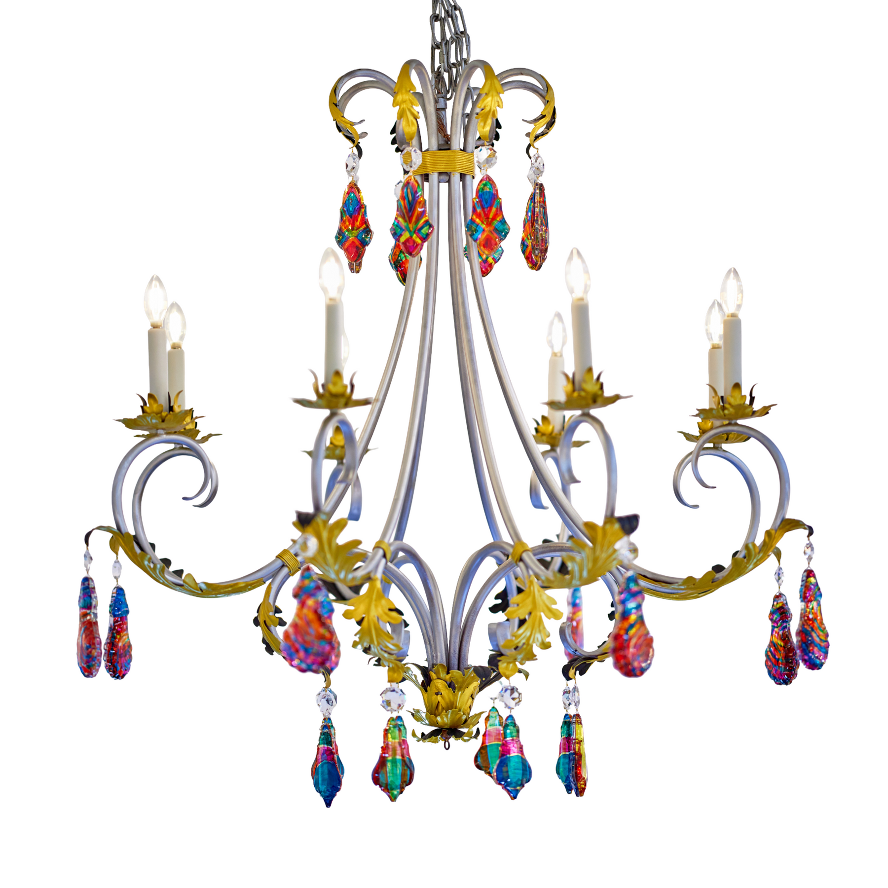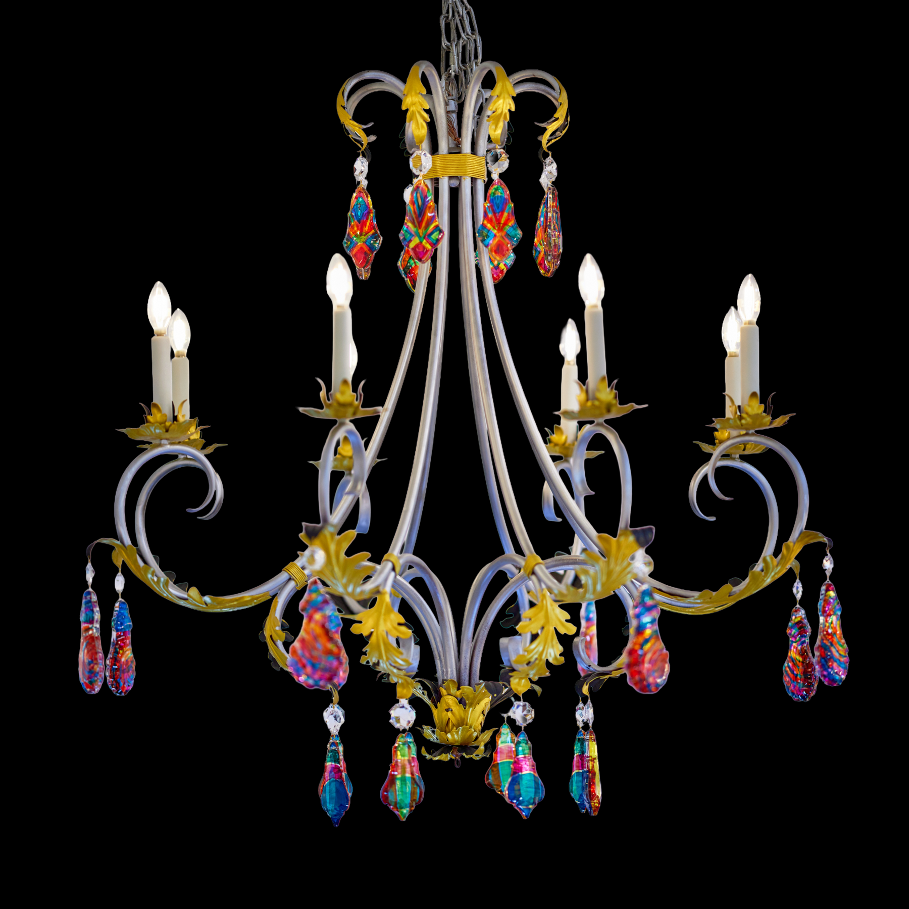 Regal, radiant, and unapologetically bold, the Queen of Suits chandelier is a true statement of luxury. This 8-light masterpiece features hand-painted crystal elements in a vivid palette that commands attention from every angle. Intricate metal arms curve gracefully outward, adorned with acanthus leaf details that add a rich, classical flourish. The harmonious blend of color, craftsmanship, and ornate design makes this chandelier not just a light fixture, but a crown jewel for any interior. Ideal for grand dining rooms, dramatic foyers, or anywhere elegance deserves to reign.