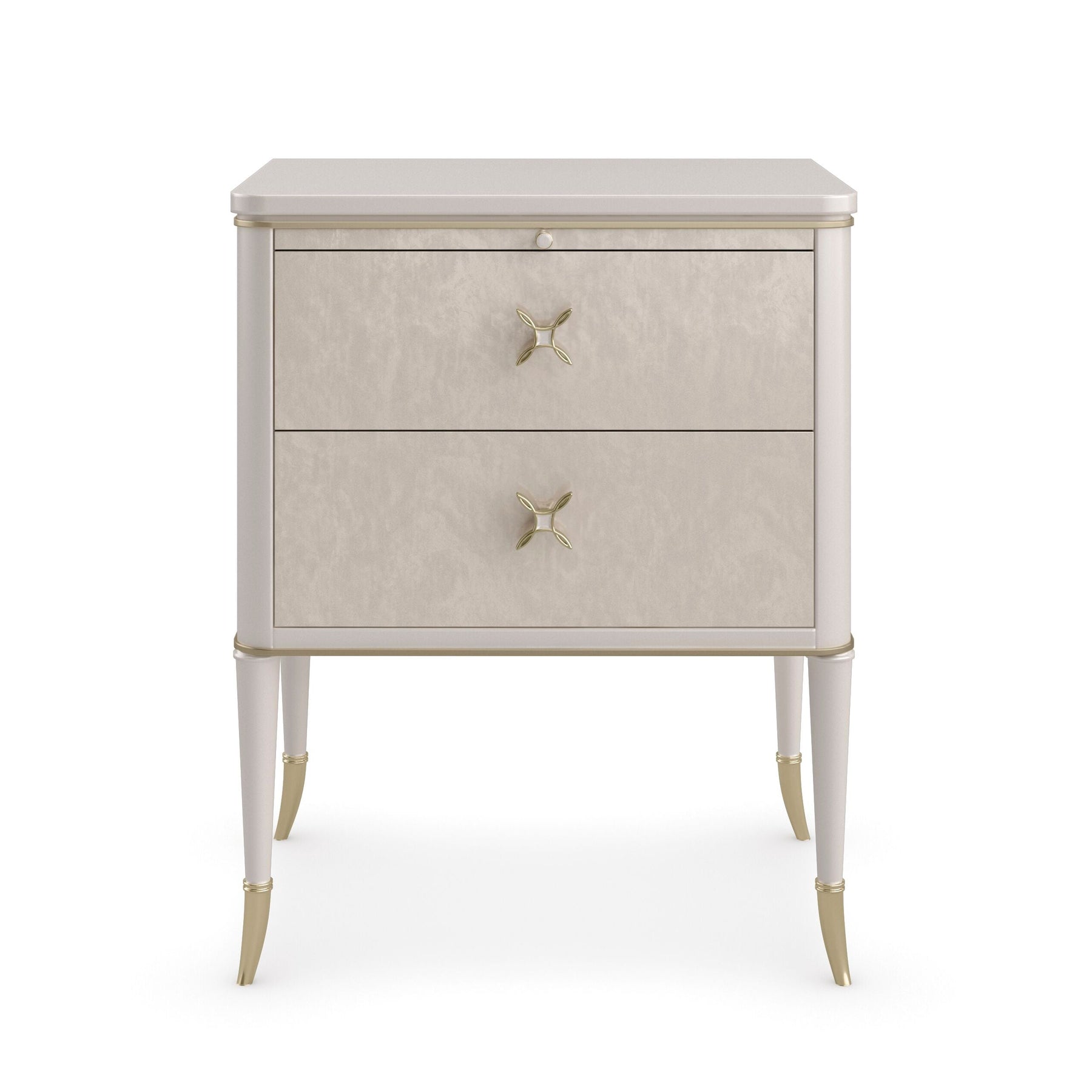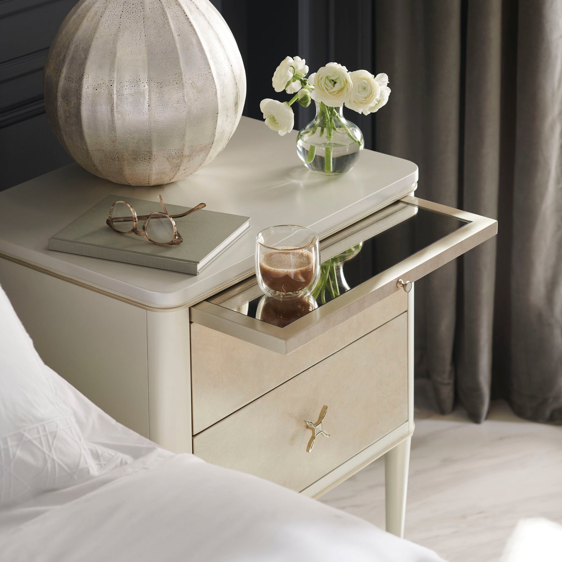 A shining example of attention to detail and materials, this nightstand offers elegant bedside storage with a hint of glitz. Encased in a shimmering Stardust finish, it features drawer fronts in a silver-dyed Madrona burl with cloud-like swirls, warmly complemented by soft gold tones and striped beading in a Platinum finish. For a luxe finishing touch: metal ferrules in a Whisper of Gold and a surprise pull-out shelf with a mirrored surface.