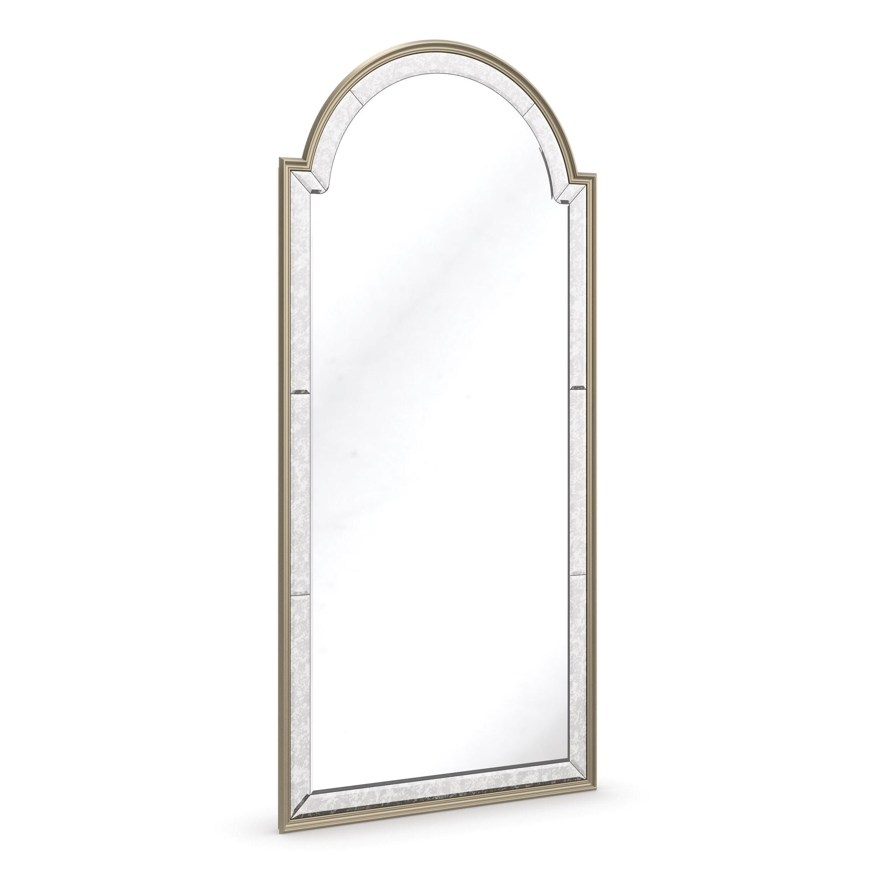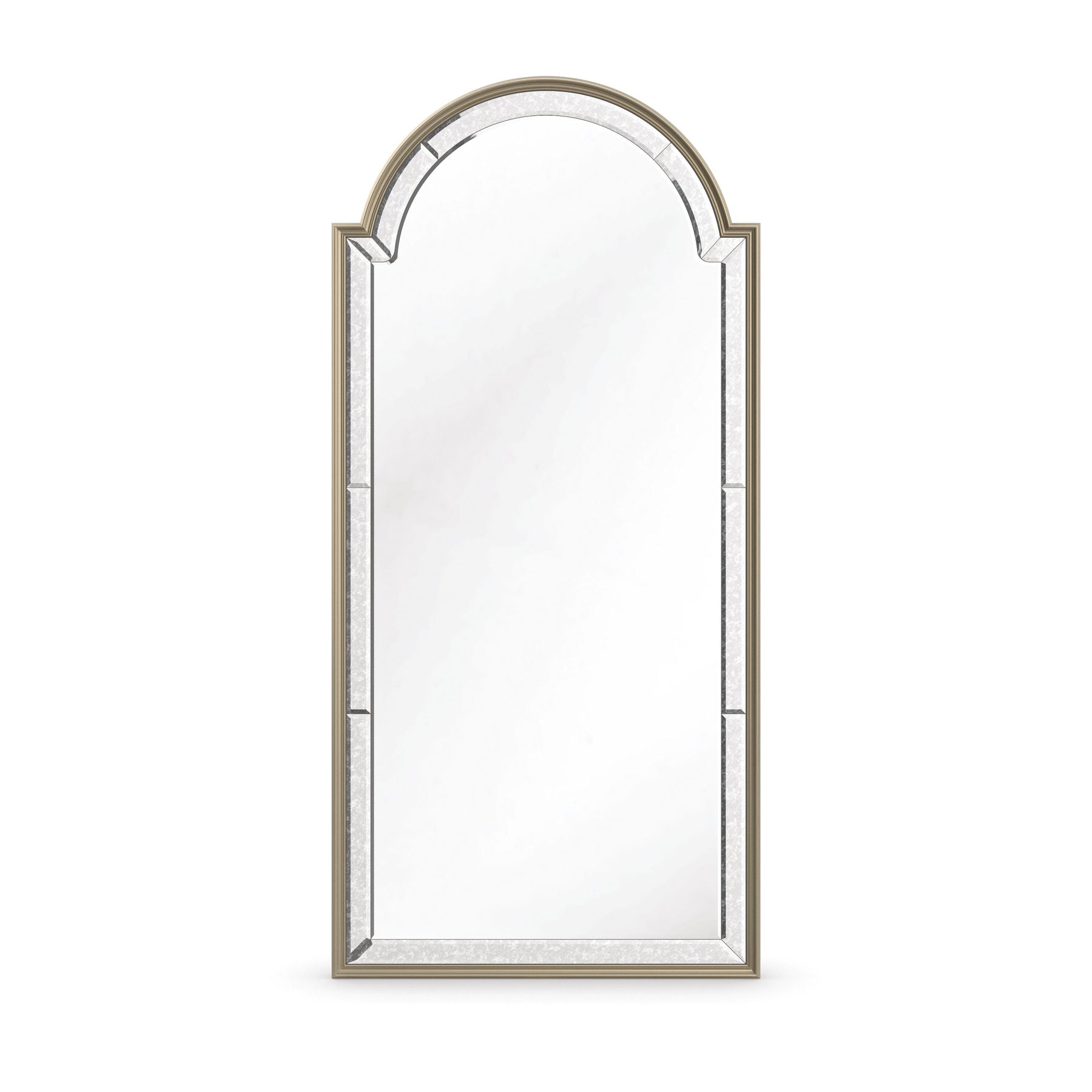 At nearly seven foot tall, this lavish floor mirror makes a grand statement, mixing casual glamour with the romance of a treasured antique. Designed to lean, rather than be hung, its classic Arabic window shape is framed in a Silver Shadow finish with an antique mirror border for a vintage aesthetic. Brightens a room and creates a sense of space; perfect for the boudoir, living or dining room.